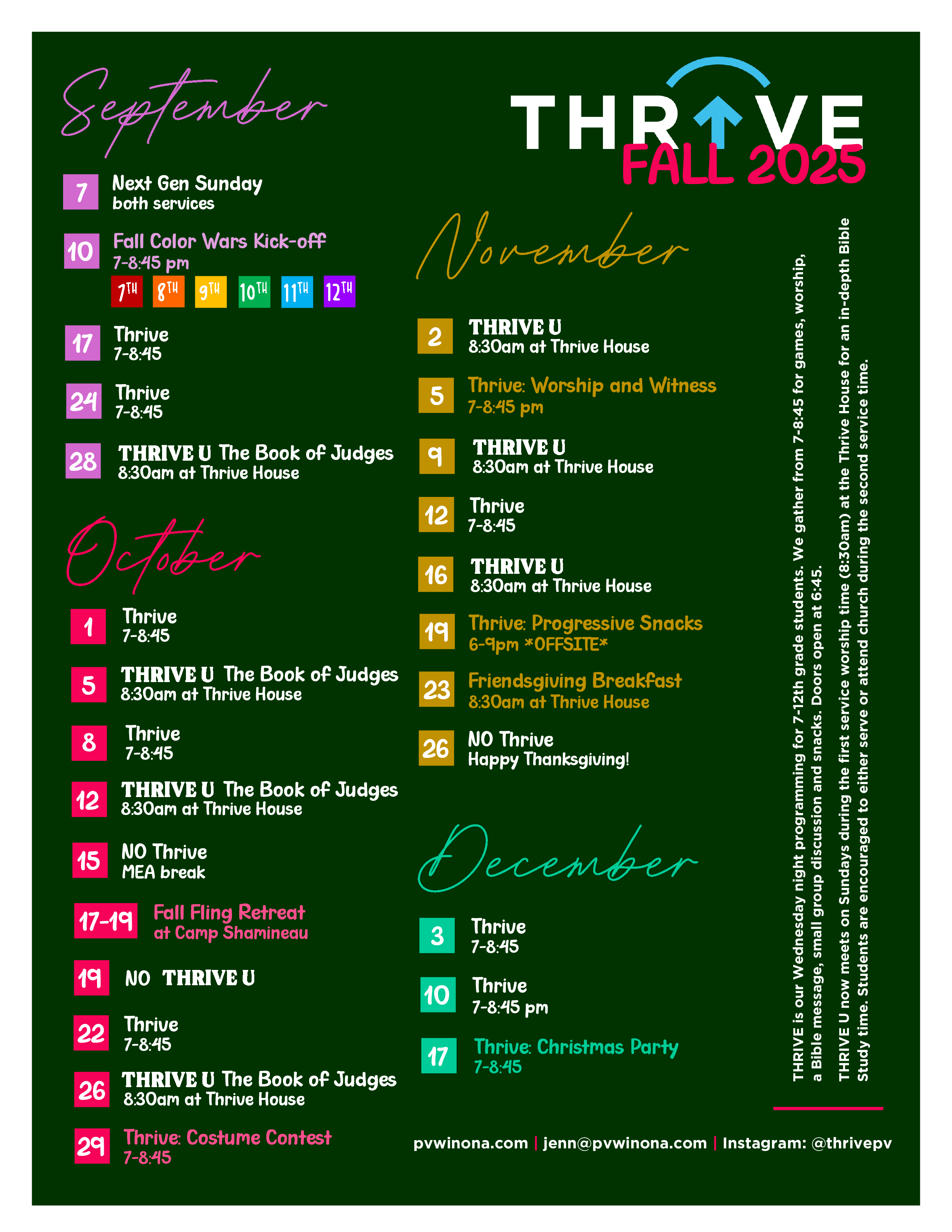 ► Thrive Programming - Doors open at 6:45pm and programming is from 7-8:45pm. Join us for fellowship, worship, a message, games and some small group time at the end!