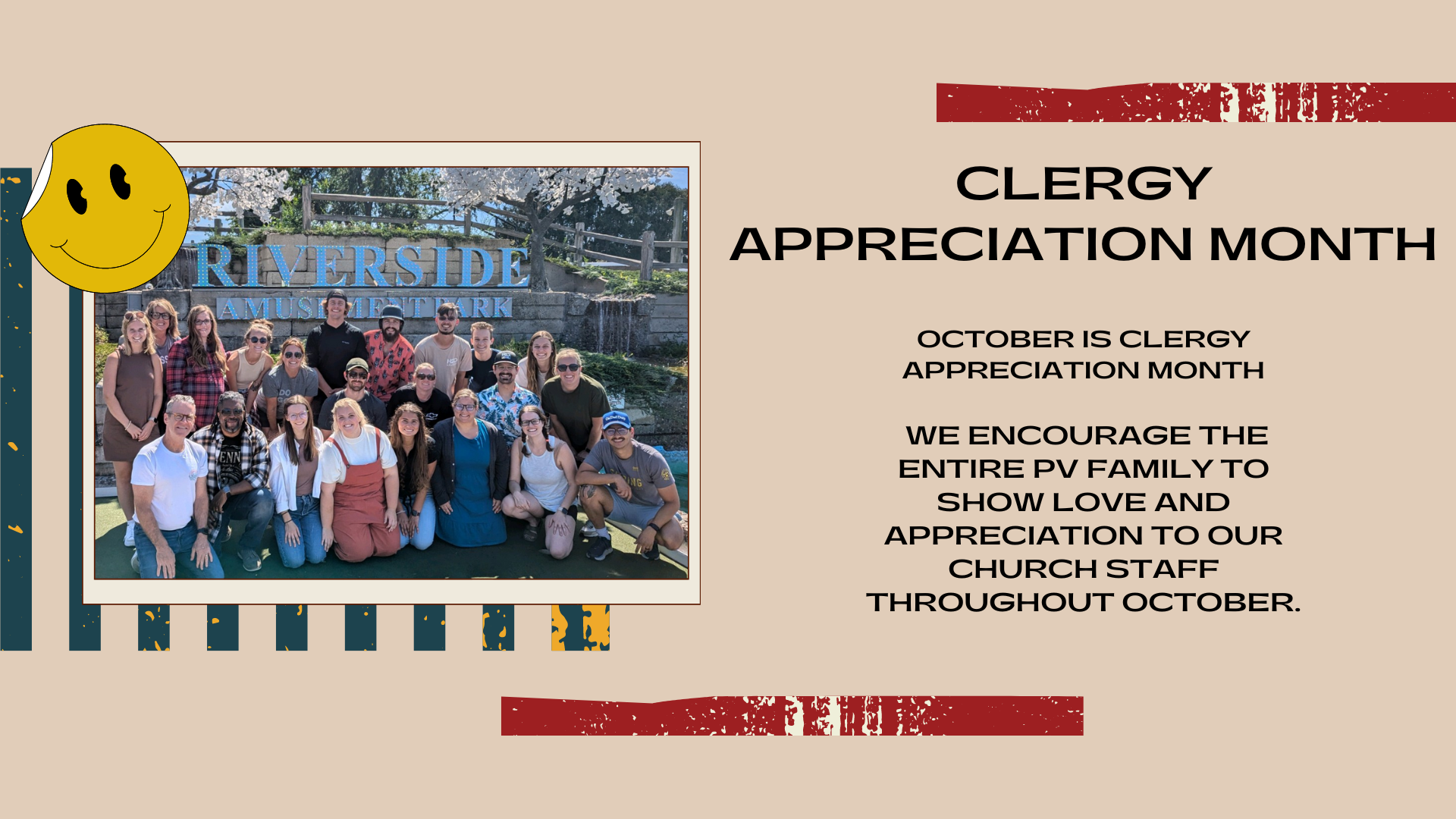 RSVPOctober is Clergy Appreciation Month1 Timothy 5:17 tells us that our church staff “are worthy of double honor, especially those whose work is preaching and teaching.” May we be a congregation that honors those who work diligently for the Gospel of Jesus Christ and His Church.We would like to encourage the entire PV family to show love and appreciation to our church staff in special ways throughout October. Be creative, have fun, and take time in whatever way the Lord leads you to demonstrate your gratefulness for the unselfish work of our ministry and support staff.