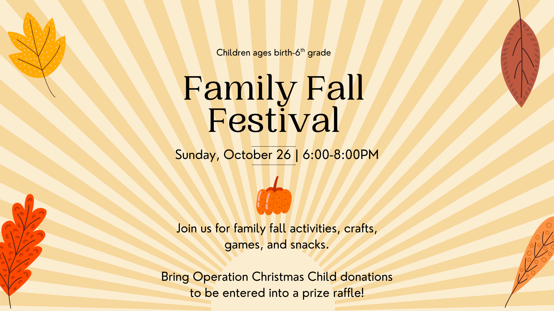 Family Fall Festival, October 26 6:00-8:00PM - Inviting all families to come to our family fall festival! There will be fun activities, crafts, games, and snacks. Bring Operation Christmas Child donations to be entered into a prize raffle. No registration necessary.
