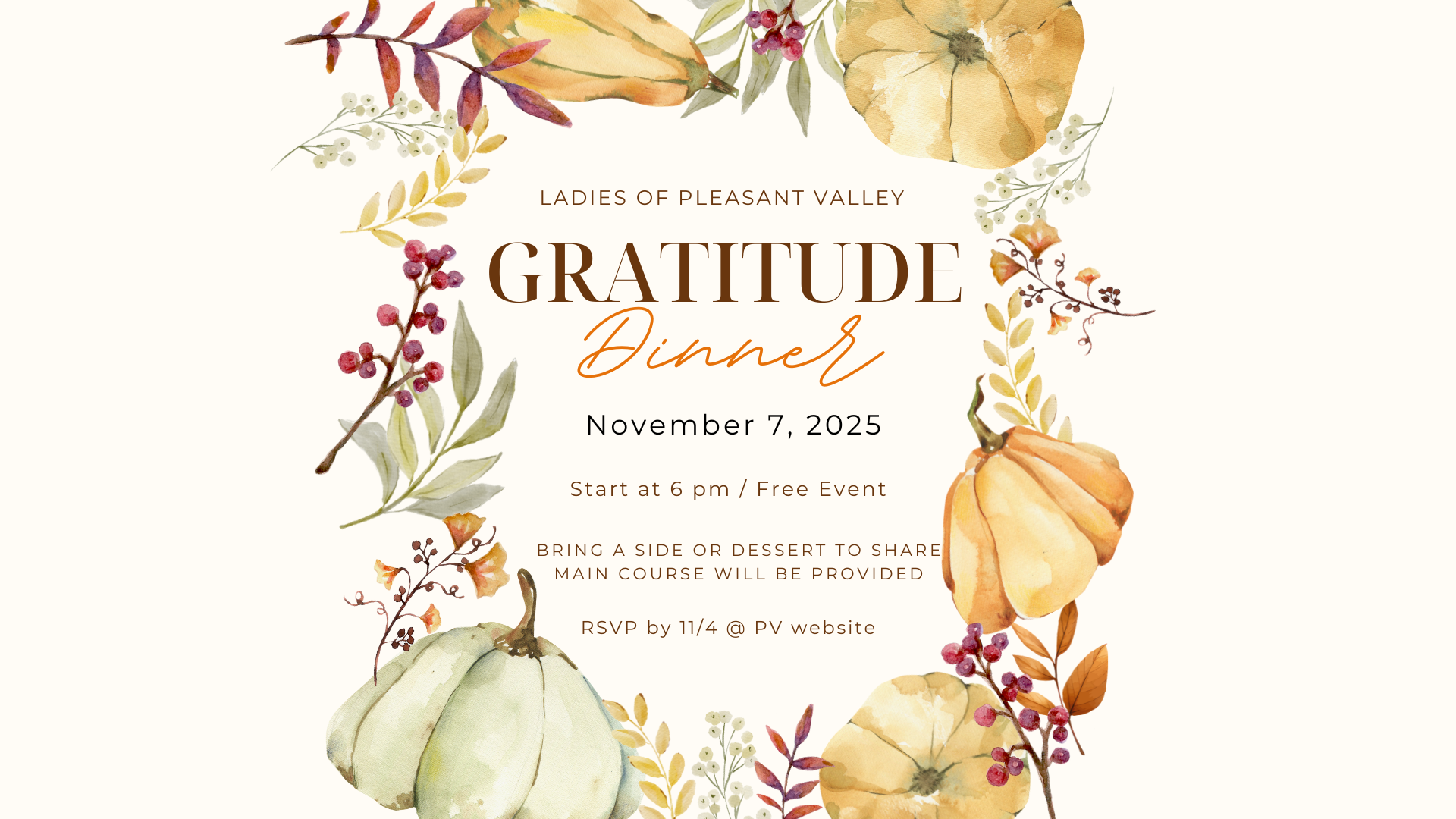 Inviting all women of Pleasant Valley to a Gratitude Dinner. We will be preparing our hearts to find a biblical source of gratitude and thankfulness before we enter the Thanksgiving season. Come find your seat at the table where all are welcome. Main course will be provided, please bring a side or dessert to share. RSVP are necessary to account for food, but this event is free. Register here! Friday, November 7 @ 6pm. Please RSVP by Tues, Nov. 4.