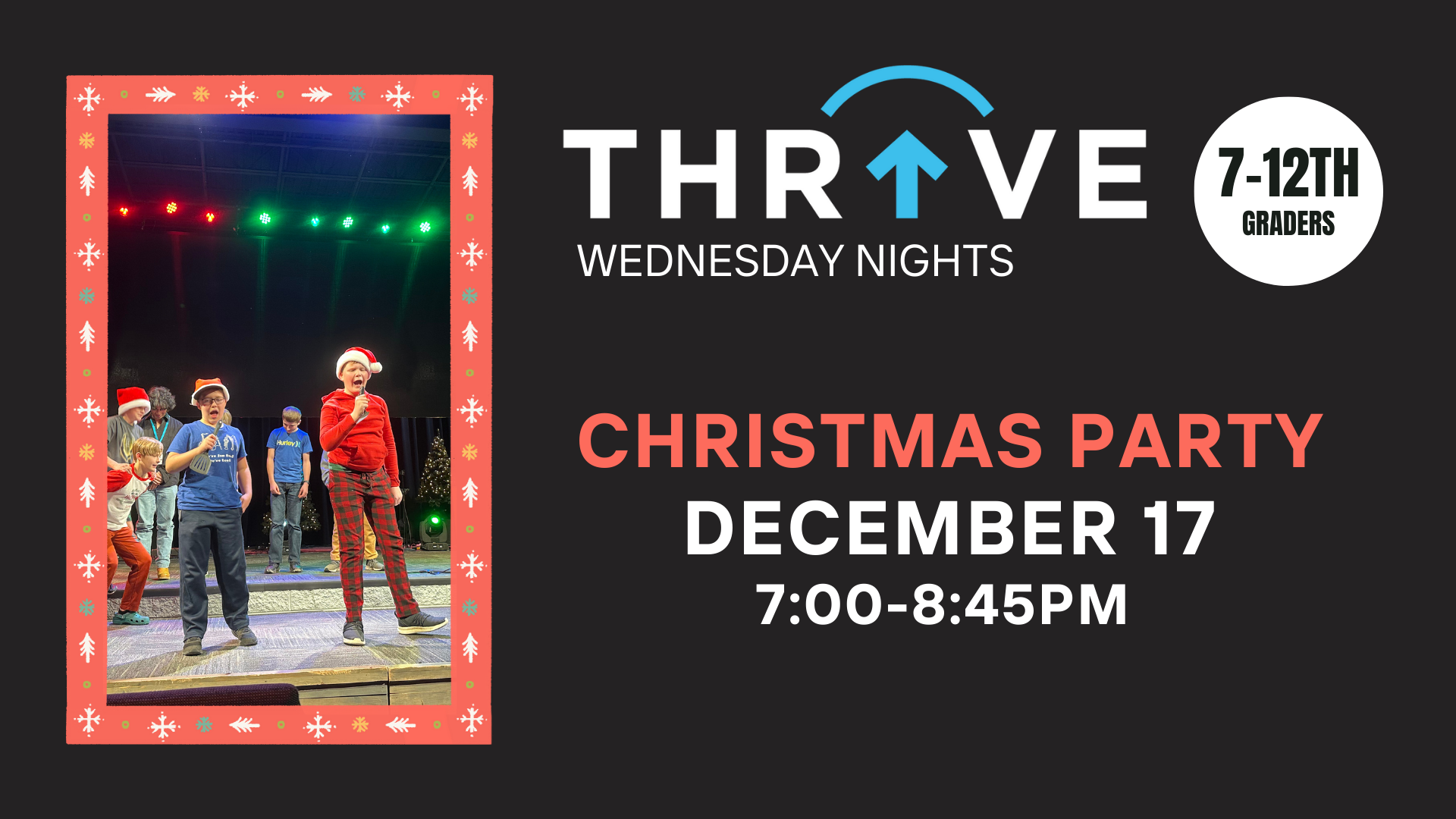 Thrive Christmas Party- Wednesday, December 17, 6:45-8:45 pm. All 7th-12th graders are welcome to come for a Christmas party!